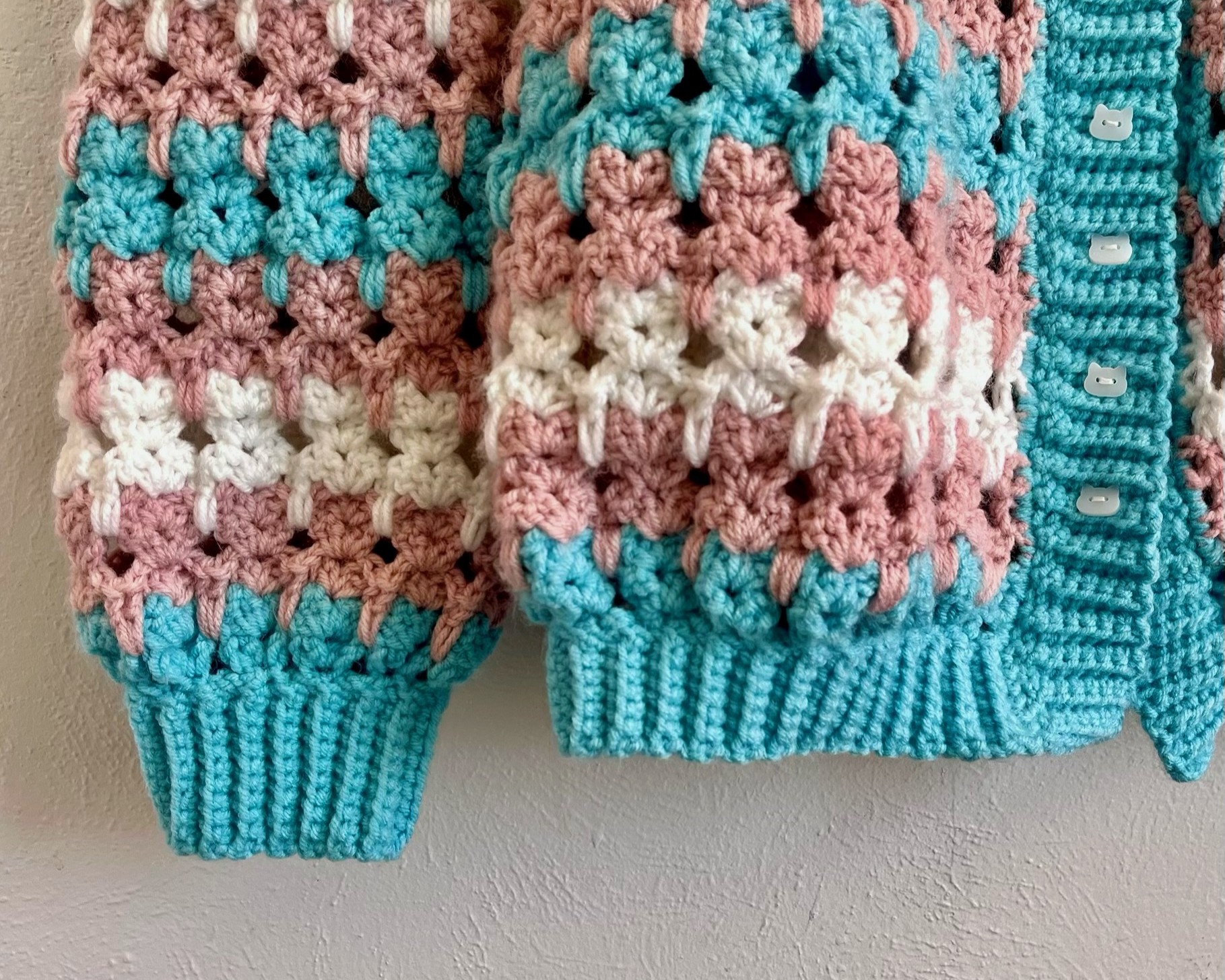 The sleeves are worked from wrist up to ensure the cats aren’t upside down.